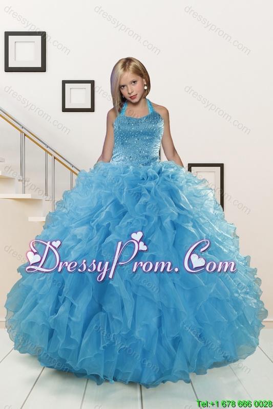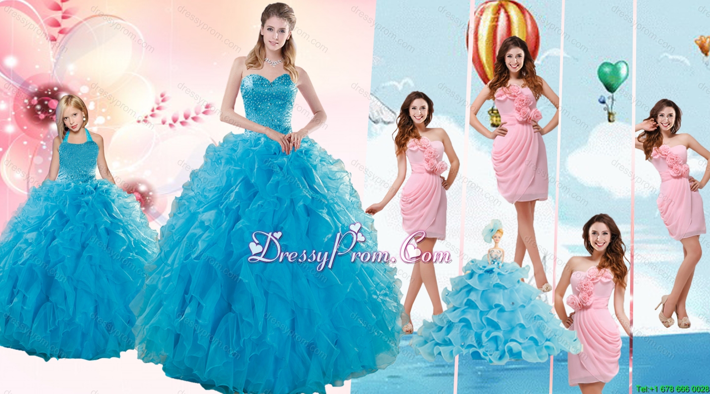 Teal Sweetheart Beading and Ruffles Sweet 16 Dress and Hand Made Flowers and Ruching Baby Pink Dama Dresses and Halter Top Ruffles Pageant Dresses for Little Girl