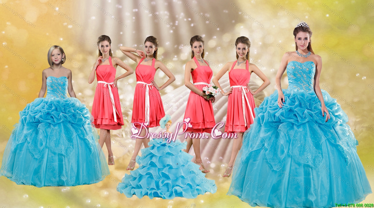 Pick Ups Floor Length Baby Blue Quinceanera Dress and Watermelon Halter Top Sash Dama Dresses and Pretty Ruffles Little Girl Dress