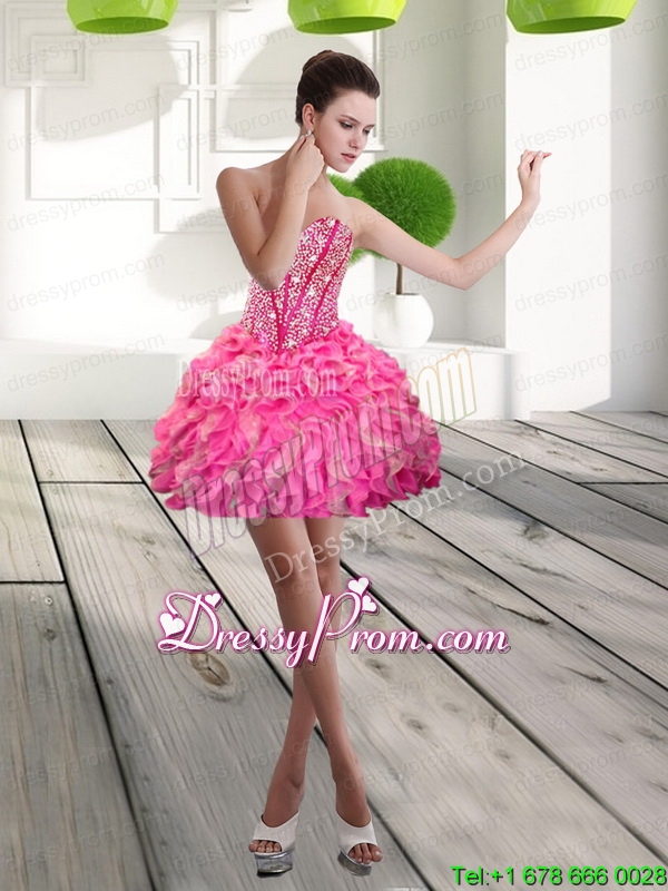 Neckline : SweetheartShown Color : Hot PinkSilhouette : Ball GownsSleeve Length : sleevelessHemline : mini lengthBack Detail : Lace upEmbellishment : Beading,RufflesOccasion : Prom,Party,Cocktail,HomecomingSeason : Spring,Summer,Fall