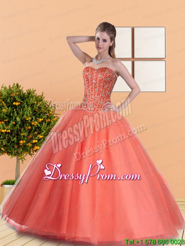 Neckline : SweetheartShown Color : Orange RedSilhouette : Ball GownsSleeve Length : sleevelessHemline : floor lengthBack Detail : Lace upFabric : TulleEmbellishment : BeadingOccasion : Military Ball,Sweet 16,QuinceaneraSeason : Spring,Summer,Fall,Winter