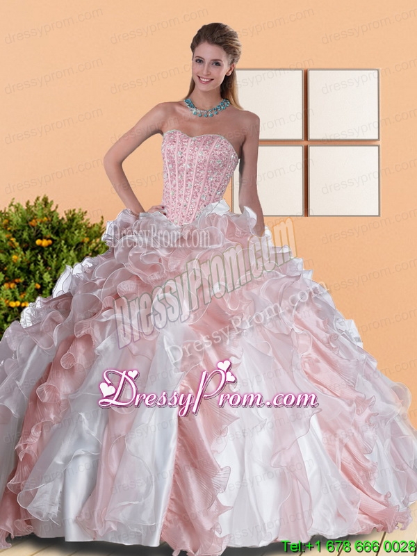 Neckline : SweetheartShown Color : Baby PinkSleeve Length : sleevelessHemline : floor lengthBack Detail : Lace upFabric : OrganzaEmbellishment : Beading,RufflesOccasion : Military Ball,Sweet 16,QuinceaneraSeason : Spring,Summer,Fall,Winter
