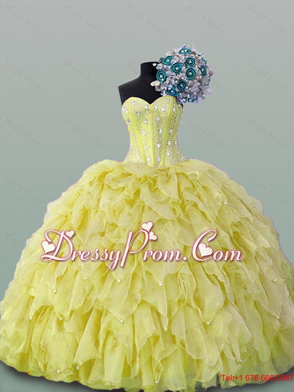 Neckline : SweetheartShown Color : GoldSilhouette : Ball GownsSleeve Length : sleevelessHemline : floor lengthBack Detail : Lace upFabric : OrganzaEmbellishment : BeadingOccasion : Military Ball,Sweet 16,QuinceaneraSeason : Spring,Summer,Fall,Winter