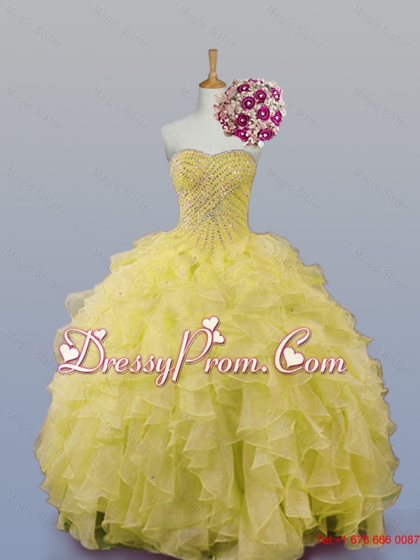 Neckline : SweetheartShown Color : Light YellowSilhouette : Ball GownsSleeve Length : sleevelessHemline : floor lengthBack Detail : Lace upFabric : OrganzaEmbellishment : BeadingOccasion : Military Ball,QuinceaneraSeason : Spring,Summer,Fall,Winter