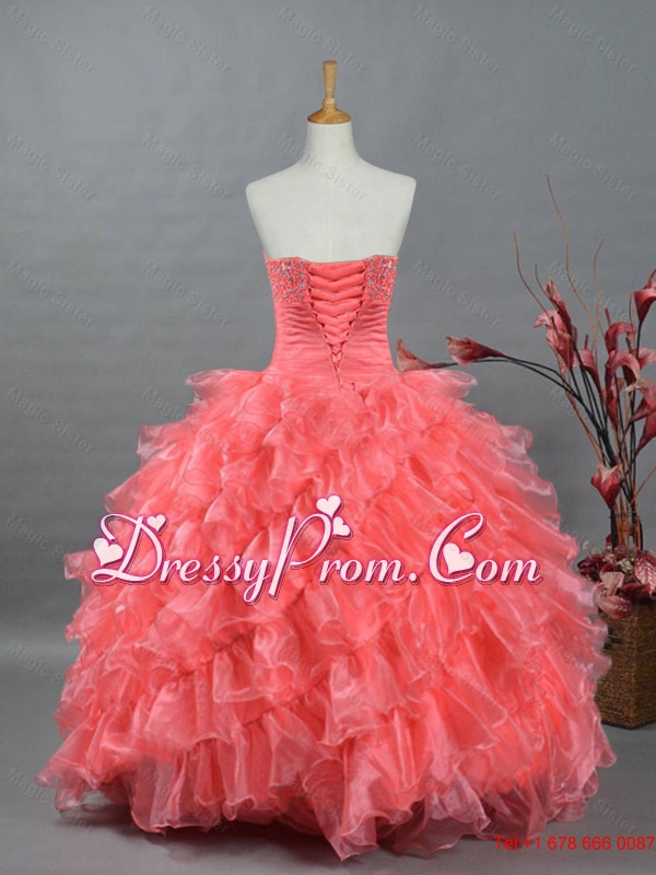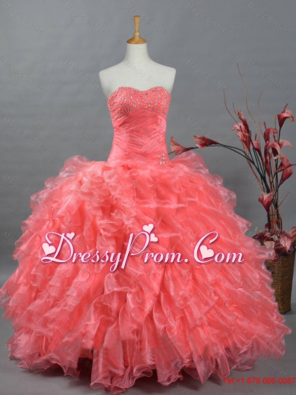 Neckline : SweetheartShown Color : Watermelon RedSilhouette : Ball GownsSleeve Length : sleevelessHemline : floor lengthBack Detail : Lace upFabric : OrganzaEmbellishment : BeadingOccasion : Military Ball,Sweet 16,QuinceaneraSeason : Spring,Summer,Fall,Winter