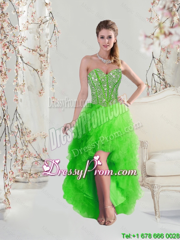 Neckline : SweetheartShown Color : Spring GreenSilhouette : A-lineSleeve Length : sleevelessHemline : high lowBack Detail : Lace upFabric : OrganzaEmbellishment : Beading,RufflesOccasion : Prom,Formal Evening,PageantSeason : Spring,Summer,Fall