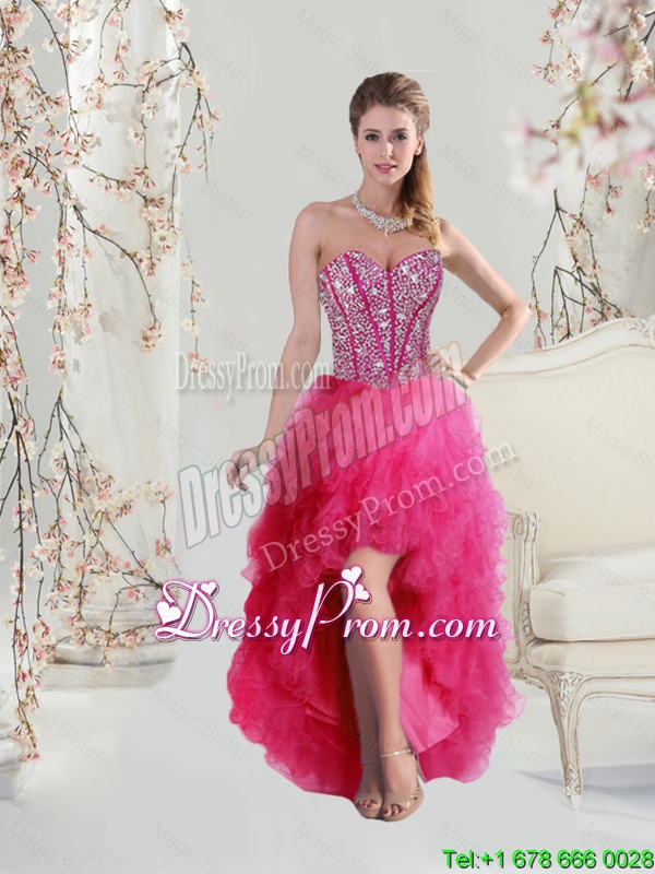 Neckline : SweetheartShown Color : Hot PinkSilhouette : A-lineSleeve Length : sleevelessHemline : high lowBack Detail : Lace upFabric : OrganzaEmbellishment : Beading,RufflesOccasion : Prom,Formal Evening,Cocktail,PageantSeason : Spring,Summer,Fall