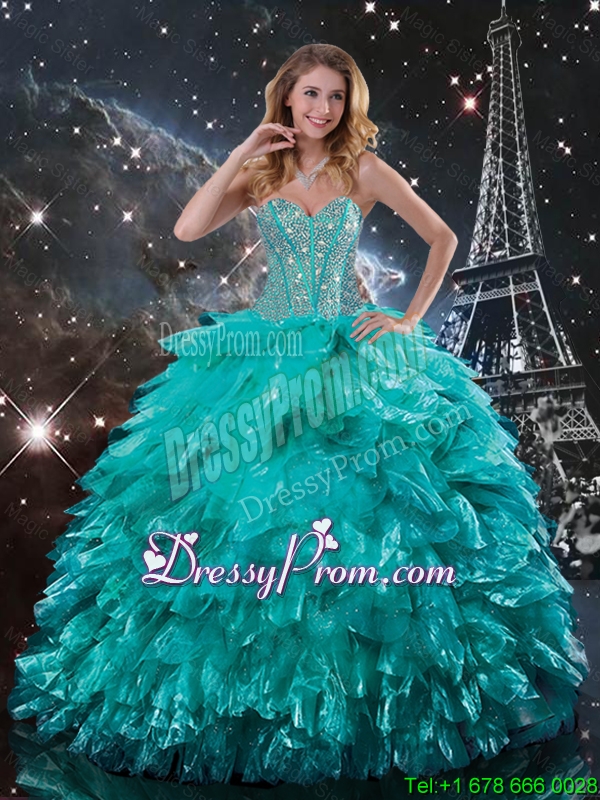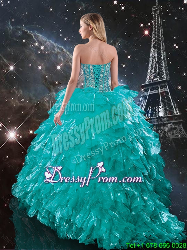 Neckline : SweetheartShown Color : TurquoiseSilhouette : Ball GownsSleeve Length : sleevelessHemline : floor lengthBack Detail : Lace upFabric : OrganzaEmbellishment : Beading,RufflesOccasion : Graduation,Military Ball,Sweet 16,QuinceaneraSeason : Spring,Summer,Fall,Winter