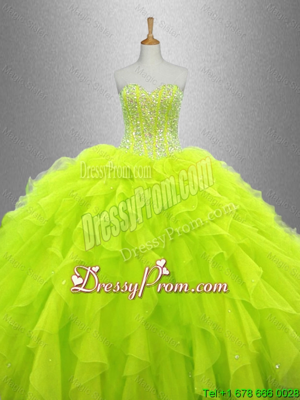 Neckline : SweetheartShown Color : Yellow GreenSilhouette : Ball GownsSleeve Length : sleevelessHemline : floor lengthBack Detail : Lace upFabric : OrganzaEmbellishment : Beading,RufflesOccasion : Military Ball,Sweet 16,QuinceaneraSeason : Spring,Summer,Fall,Winter
