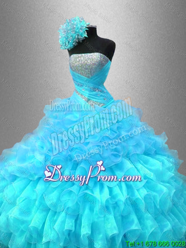 Neckline : StraplessShown Color : BlueSilhouette : Ball GownsSleeve Length : sleevelessHemline : floor lengthBack Detail : Lace upFabric : OrganzaEmbellishment : Ruffles,SequinsOccasion : Military Ball,Sweet 16,QuinceaneraSeason : Spring,Summer,Fall,Winter