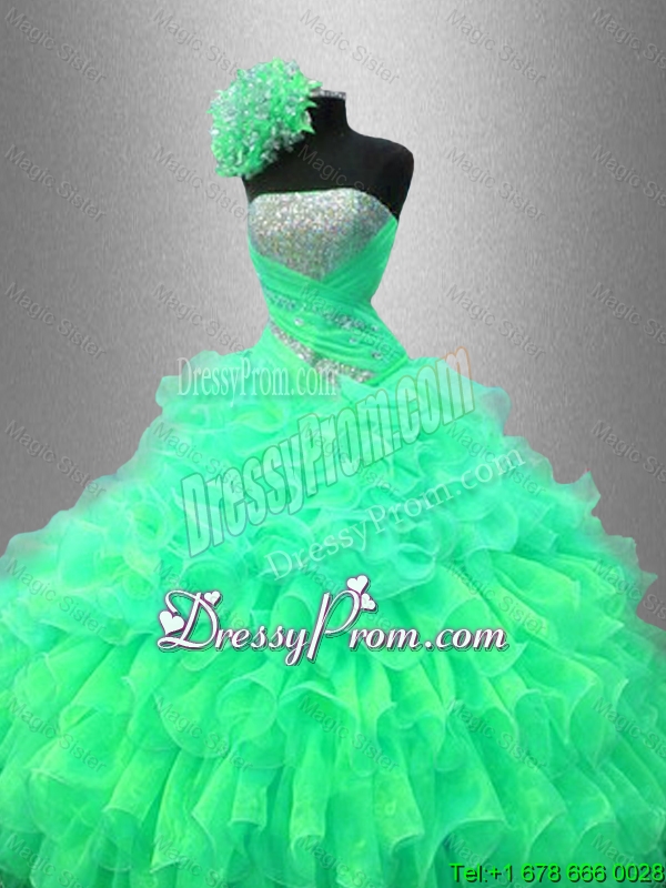 Neckline : StraplessShown Color : GreenSilhouette : Ball GownsSleeve Length : sleevelessHemline : floor lengthBack Detail : Lace upFabric : OrganzaEmbellishment : Ruffles,SequinsOccasion : Military Ball,Sweet 16,QuinceaneraSeason : Spring,Summer,Fall,Winter
