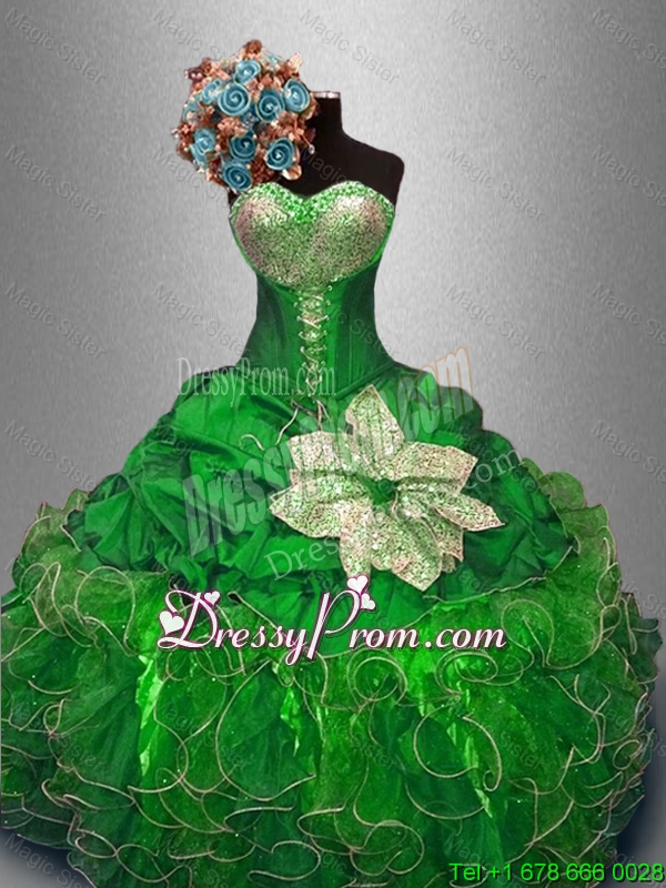 Neckline : SweetheartShown Color : GreenSilhouette : Ball GownsSleeve Length : sleevelessHemline : floor lengthBack Detail : Lace upFabric : Organza,TaffetaEmbellishment : Ruffles,SequinsOccasion : Military Ball,Sweet 16,QuinceaneraSeason : Spring,Summer,Fall,Winter