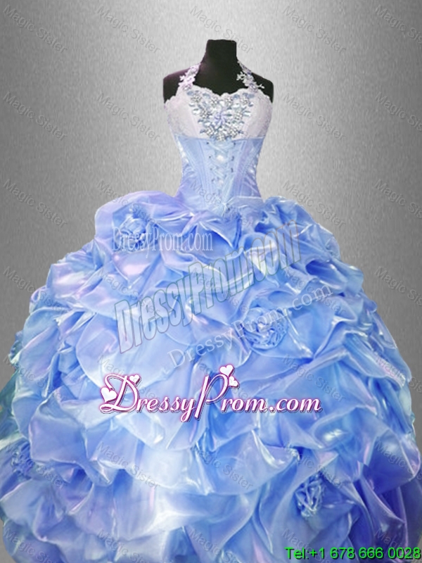 Neckline : Halter topShown Color : LavenderSilhouette : Ball GownsSleeve Length : sleevelessHemline : floor lengthBack Detail : Lace upFabric : OrganzaEmbellishment : Pick Ups,Hand Made FlowerOccasion : Military Ball,Sweet 16,QuinceaneraSeason : Spring,Summer,Fall,Winter