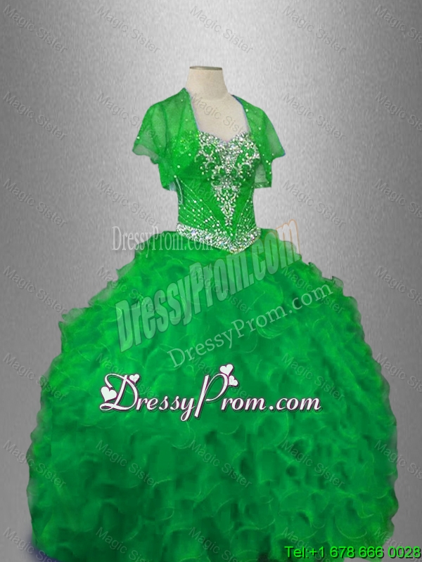 Neckline : SweetheartShown Color : GreenSilhouette : Ball GownsSleeve Length : sleevelessHemline : floor lengthBack Detail : Lace upFabric : OrganzaEmbellishment : Beading,RufflesOccasion : Military Ball,Sweet 16,QuinceaneraSeason : Spring,Summer,Fall,Winter