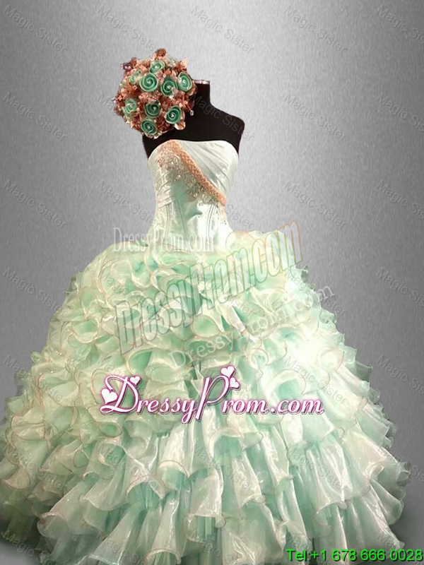 Neckline : StraplessShown Color : Apple GreenSilhouette : Ball GownsSleeve Length : sleevelessHemline : floor lengthBack Detail : Lace upFabric : OrganzaEmbellishment : Beading,RufflesOccasion : Military Ball,Sweet 16,QuinceaneraSeason : Spring,Summer,Fall,Winter