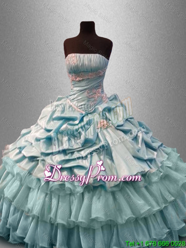 Neckline : StraplessShown Color : Light BlueSilhouette : Ball GownsSleeve Length : sleevelessHemline : floor lengthBack Detail : Lace upFabric : Organza,TaffetaEmbellishment : Beading,Pick UpsOccasion : Military Ball,Sweet 16,QuinceaneraSeason : Spring,Summer,Fall,Winter