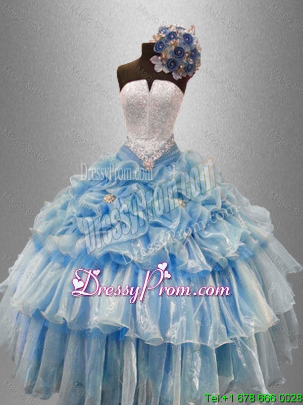 Neckline : StraplessShown Color : BlueSilhouette : Ball GownsSleeve Length : sleevelessHemline : floor lengthBack Detail : Lace upFabric : OrganzaEmbellishment : Beading,Ruffled Layers,Pick UpsOccasion : Military Ball,Sweet 16,QuinceaneraSeason : Spring,Summer,Fall,Winter