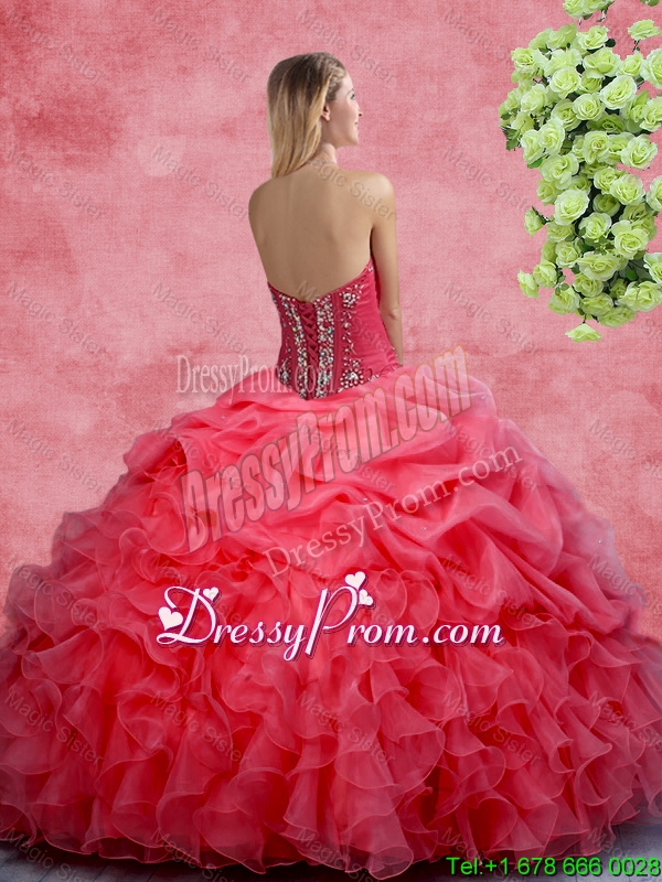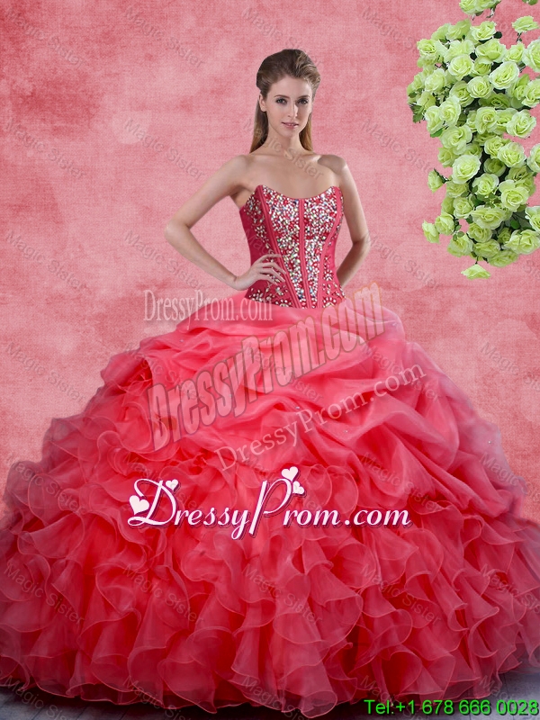 Neckline : StraplessShown Color : Coral RedSilhouette : Ball GownsSleeve Length : sleevelessHemline : floor lengthBack Detail : Lace upFabric : OrganzaEmbellishment : Beading,RufflesOccasion : Military Ball,Sweet 16,QuinceaneraSeason : Spring,Summer,Fall,Winter