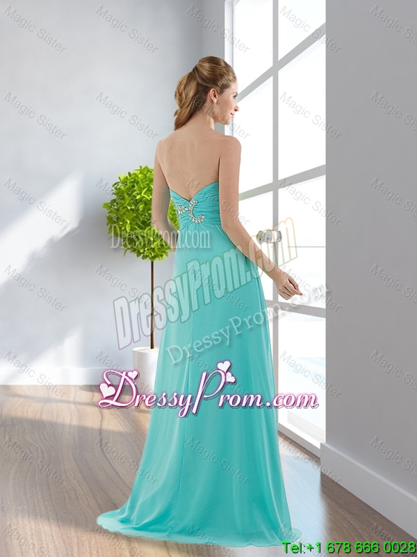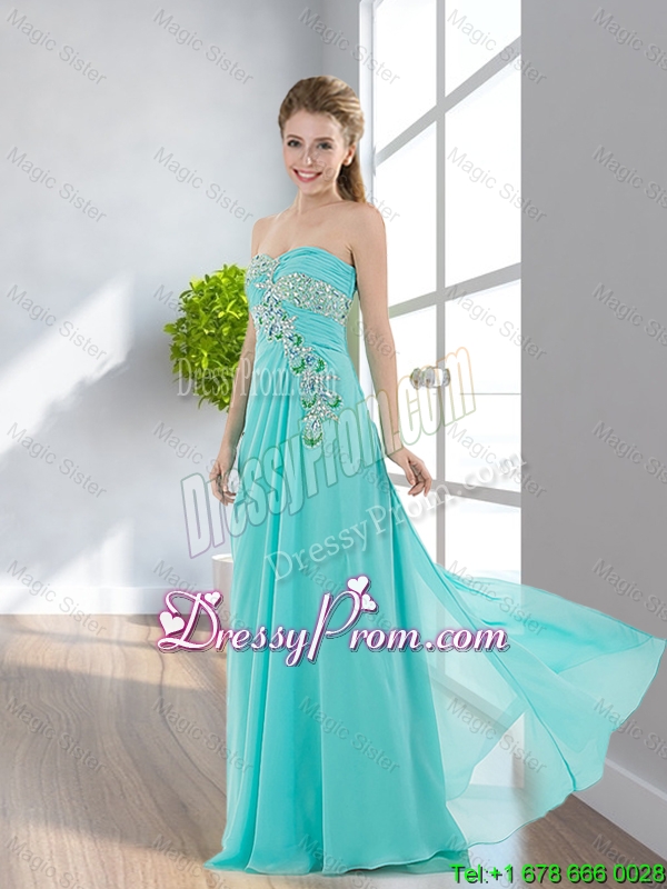 Neckline : SweetheartShown Color : Aqua BlueSilhouette : EmpireSleeve Length : sleevelessHemline : with trainBack Detail : BacklessFabric : ChiffonEmbellishment : Beading,Appliques,RuchingOccasion : Prom,Formal Evening,Party,Homecoming,GraduationSeason : Spring,Summer,Fall,Winter