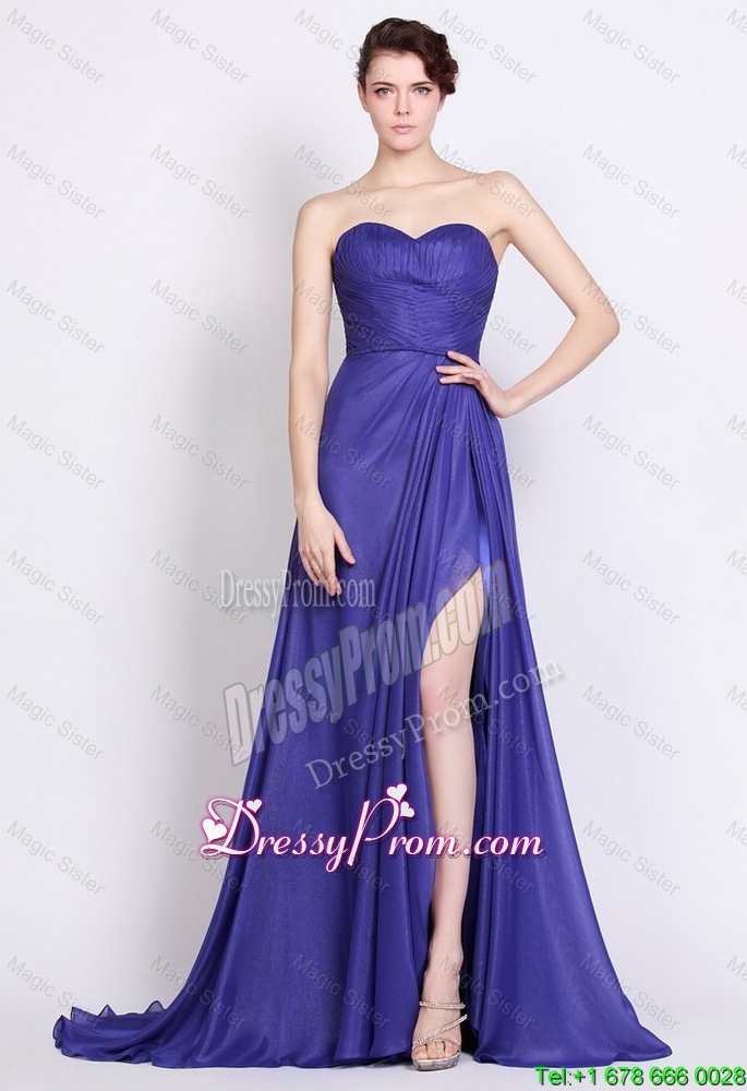 Neckline : SweetheartShown Color : PurpleSilhouette : EmpireSleeve Length : sleevelessHemline : with trainBack Detail : ZipperFabric : ChiffonEmbellishment : RuchingOccasion : Prom,Formal Evening,PageantSeason : Spring,Summer,Fall,Winter