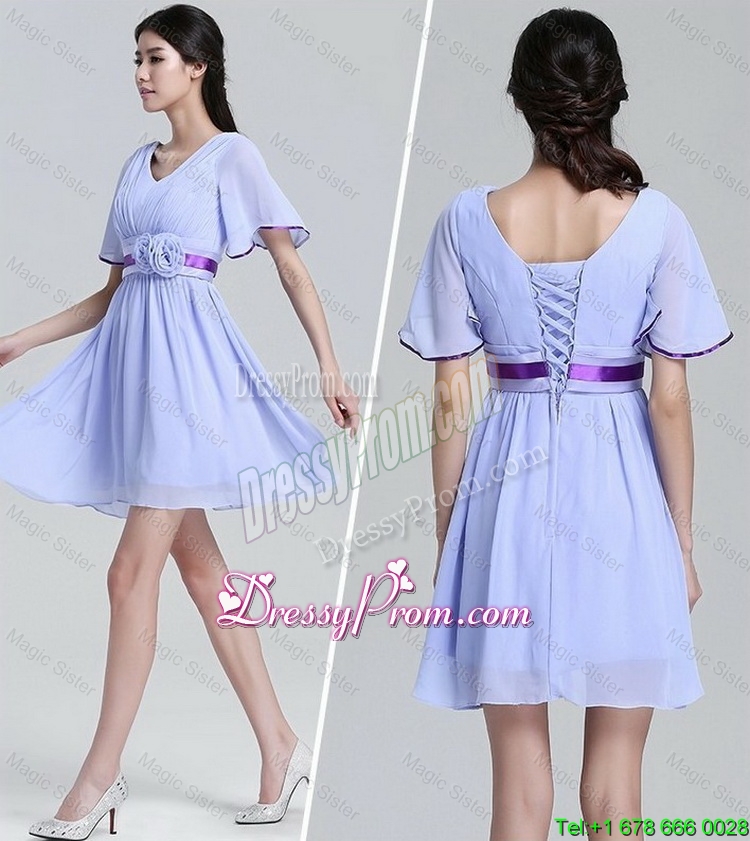 Neckline : V-neck Shown Color : Lavender Silhouette : Short Sleeve Length : short sleeves Hemline : mini length Back Detail : Lace up Fabric : Chiffon Embellishment : Hand Made Flower Occasion : Prom,Party,Cocktail,Homecoming,Graduation Season : Spring,Summer,Fall