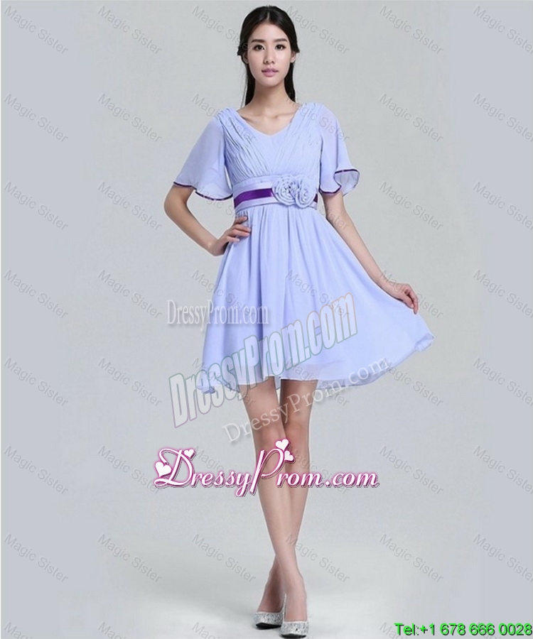 Popular V Neck Short Sleeves Short Prom Dresses 2015 with Hand Made Flowers