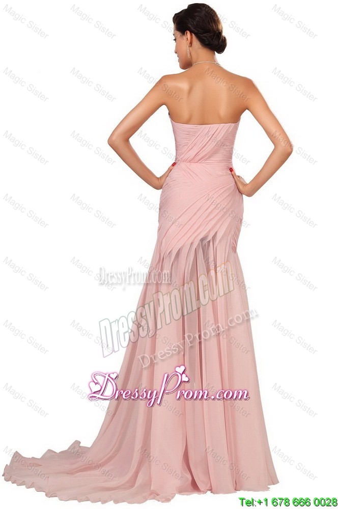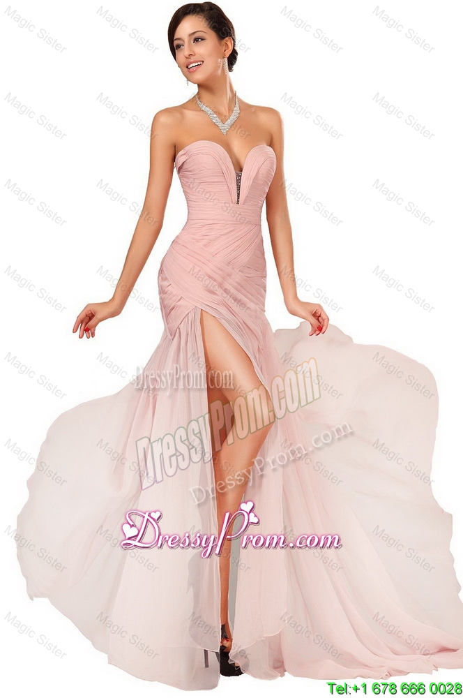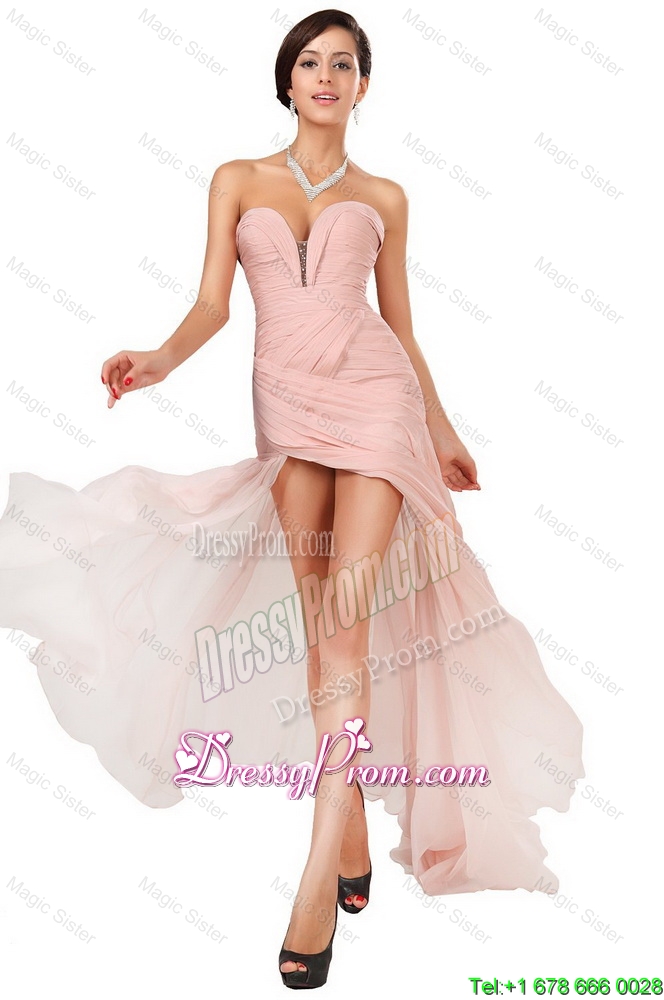Neckline : SweetheartShown Color : Pink Silhouette : Column/SheathSleeve Length : sleevelessHemline : asymmetricalBack Detail : Side zipperFabric : ChiffonEmbellishment : RuchingOccasion : Prom,Formal Evening,PageantSeason : Spring,Summer,Fall,Winter