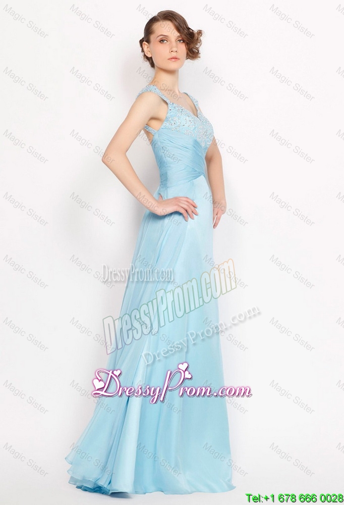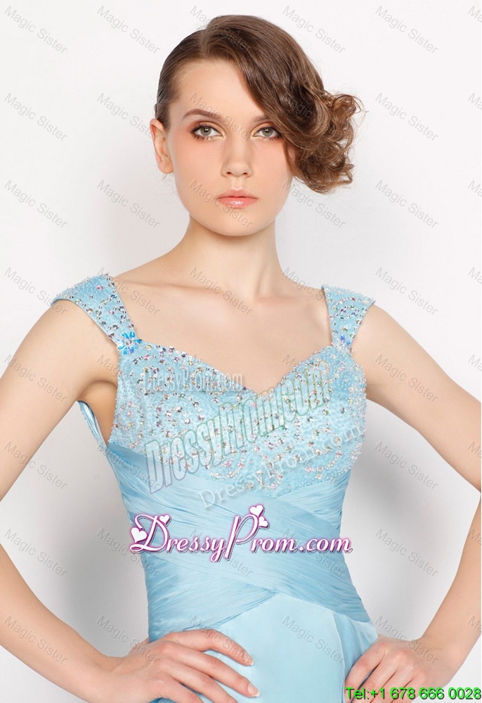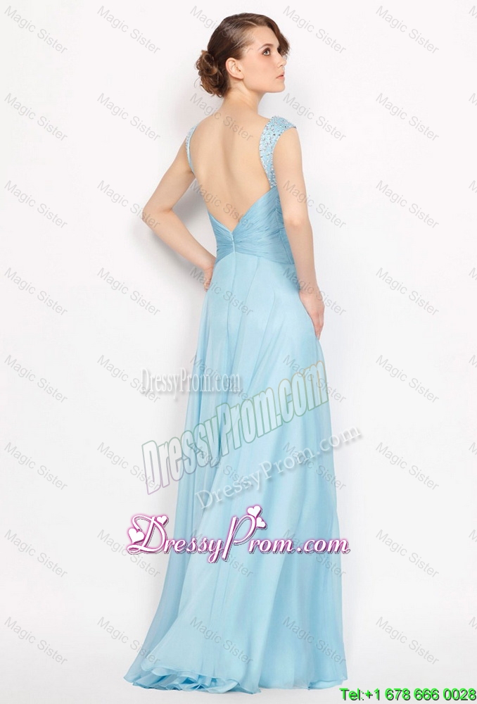 Neckline : StrapsShown Color : Light BlueSilhouette : EmpireSleeve Length : sleevelessHemline : with trainBack Detail : ZipperFabric : ChiffonEmbellishment : Beading,RuchingOccasion : Prom,Formal Evening,Pageant,HolidaySeason : Spring,Summer,Fall,Winter
