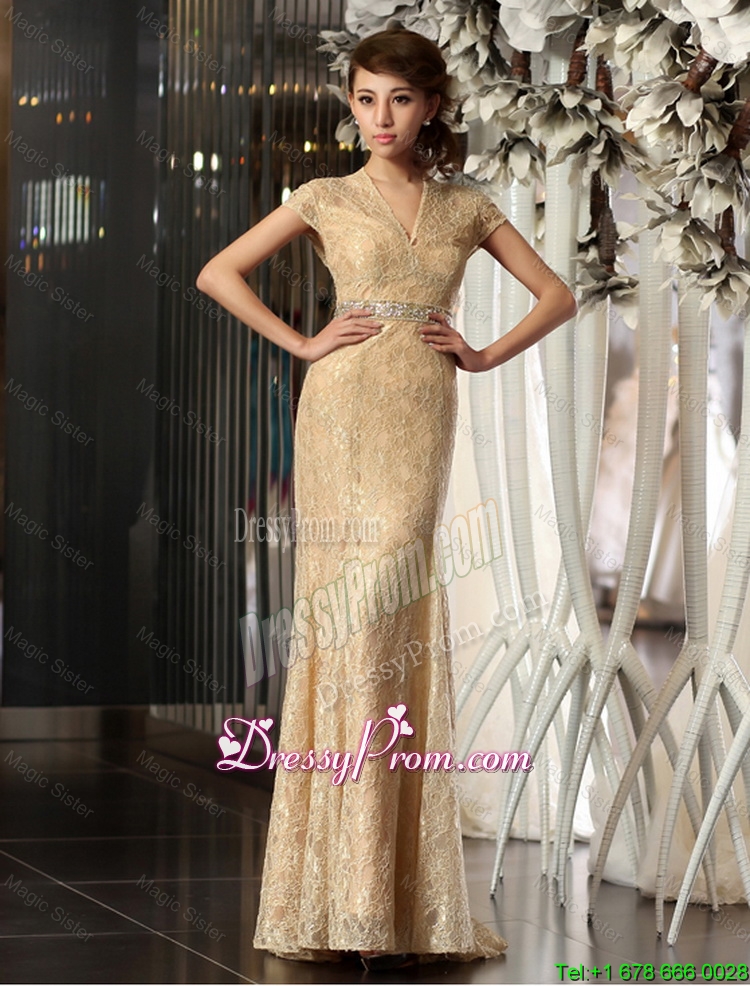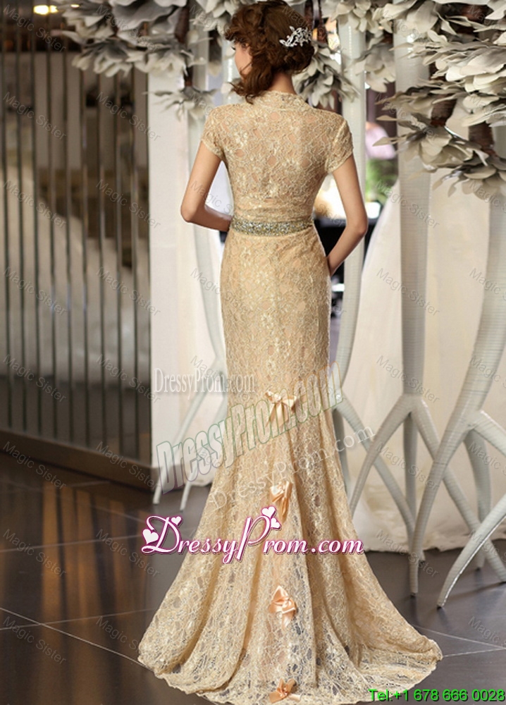 Neckline : V-neckShown Color : ChampagneSilhouette : Column/SheathSleeve Length : short sleevesHemline : with trainBack Detail : ZipperFabric : LaceEmbellishment : Lace,BowknotOccasion : Prom,Formal Evening,Graduation,HolidaySeason : Spring,Summer,Fall,Winter