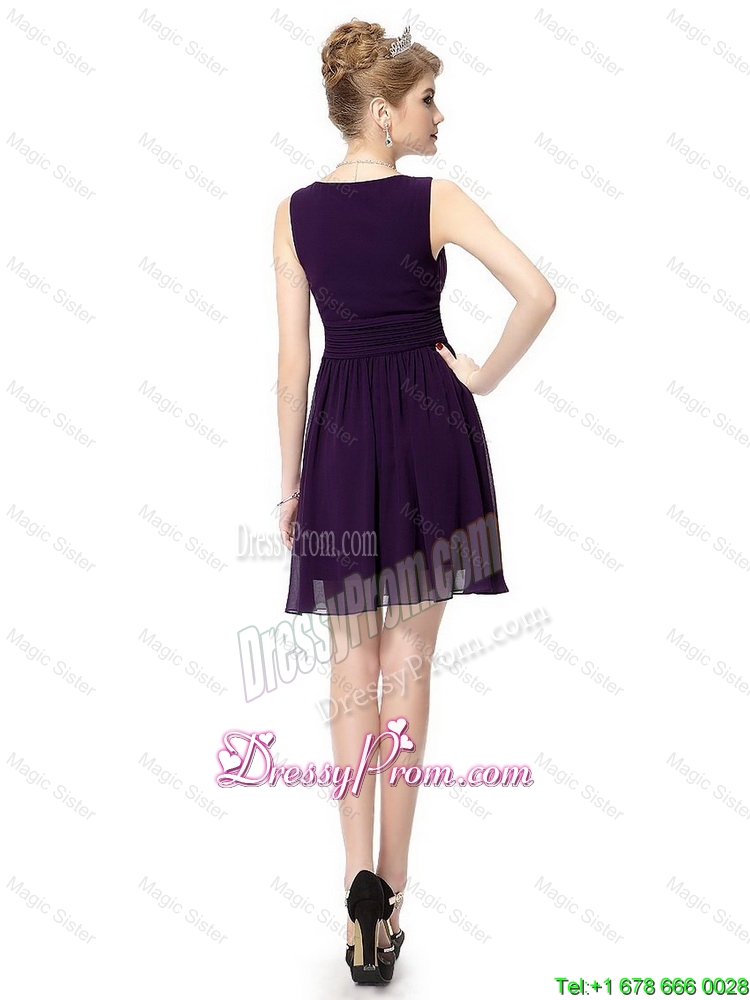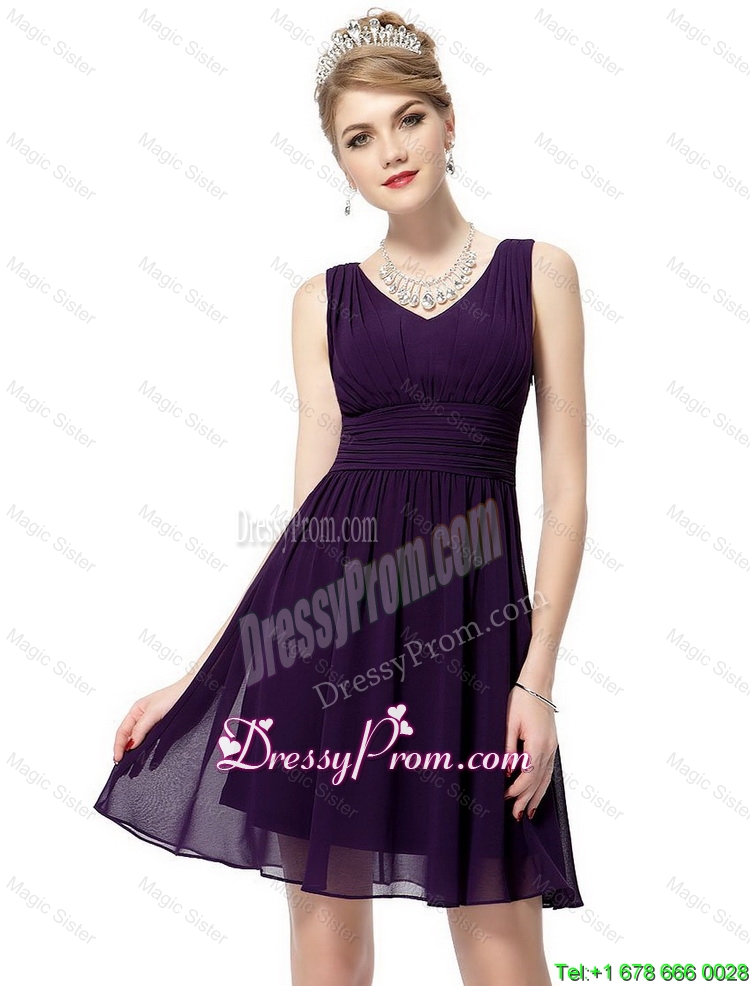 Neckline : V-neckShown Color : Dark PurpleSilhouette : ShortSleeve Length : sleevelessHemline : mini lengthBack Detail : Side zipperFabric : ChiffonEmbellishment : RuchingOccasion : Prom,Party,Cocktail,Homecoming,Graduation,HolidaySeason : Spring,Summer,Fall