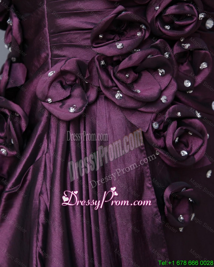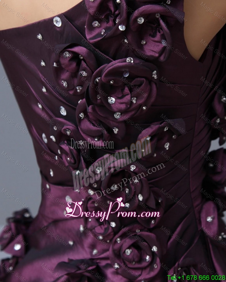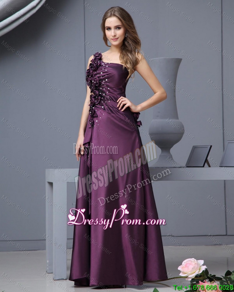 Neckline : One shoulderShown Color : Dark PurpleSilhouette : EmpireSleeve Length : sleevelessHemline : floor lengthBack Detail : Side zipperFabric : TaffetaEmbellishment : Beading,Hand Made FlowerOccasion : Prom,Formal Evening,Homecoming,Graduation,Pageant,HolidaySeason : Spring,Summer,Fall,Winter