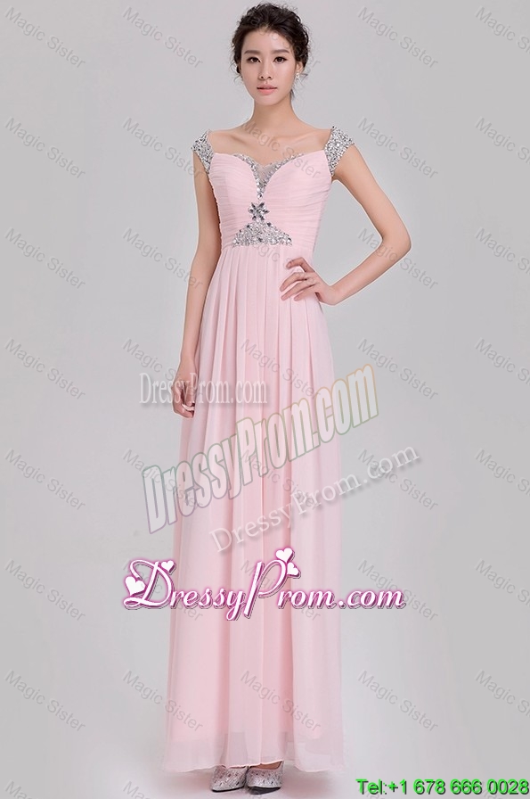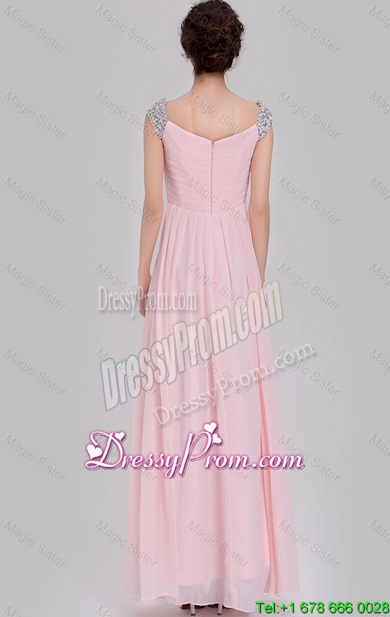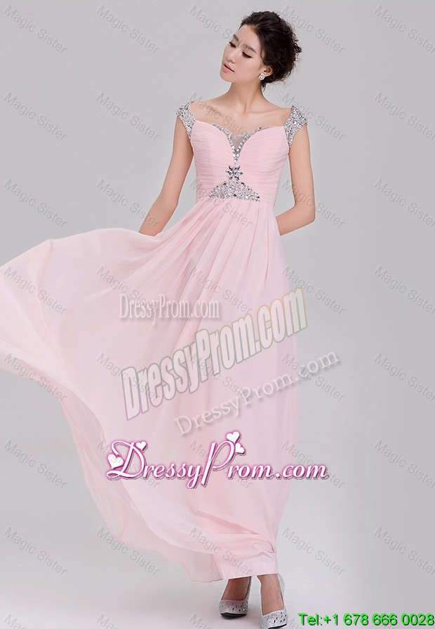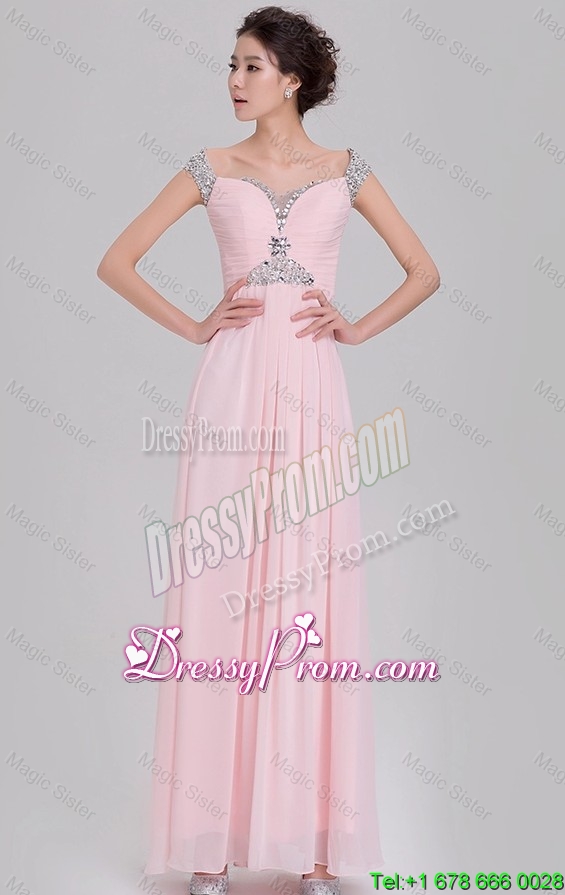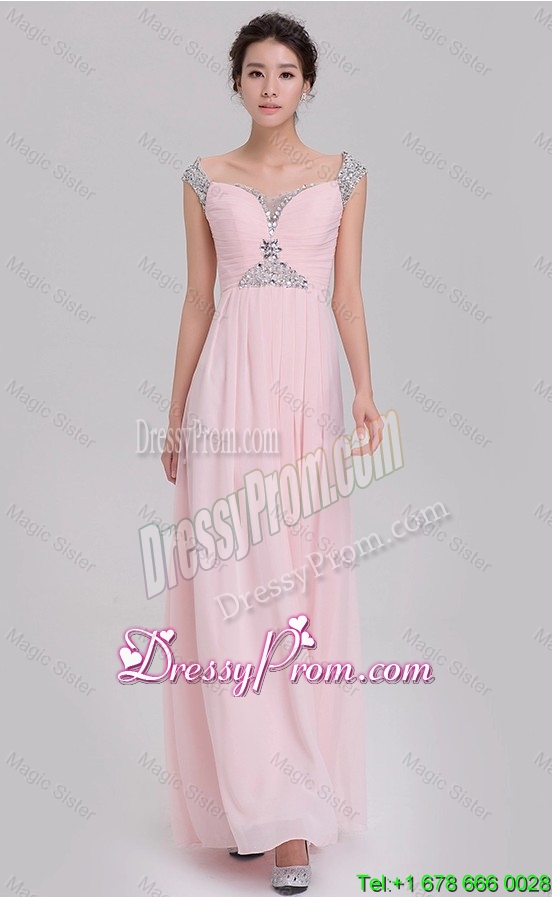 Neckline : Off the shoulderShown Color : Baby PinkSilhouette : EmpireSleeve Length : cap sleevesHemline : floor lengthBack Detail : ZipperFabric : ChiffonEmbellishment : Beading,RuchingOccasion : Prom,Formal Evening,PageantSeason : Spring,Summer,Fall,Winter