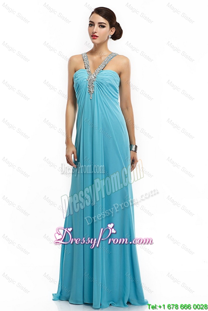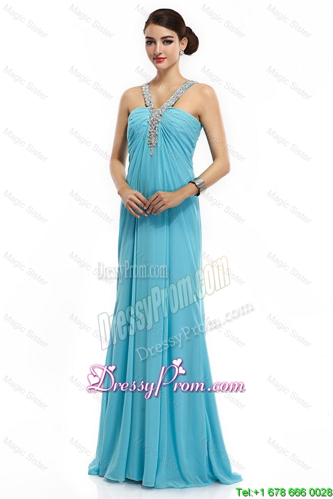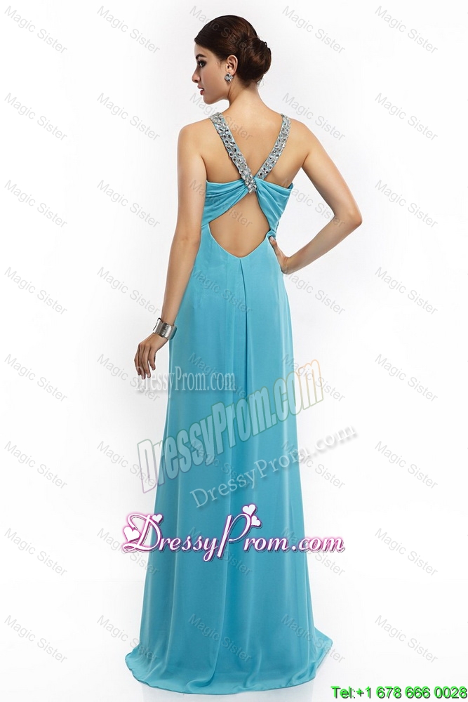 Neckline : StrapsShown Color : Aqua BlueSilhouette : EmpireSleeve Length : sleevelessHemline : with trainBack Detail : Criss crossFabric : ChiffonEmbellishment : Beading,RuchingOccasion : Prom,Formal Evening,PageantSeason : Spring,Summer,Fall,Winter