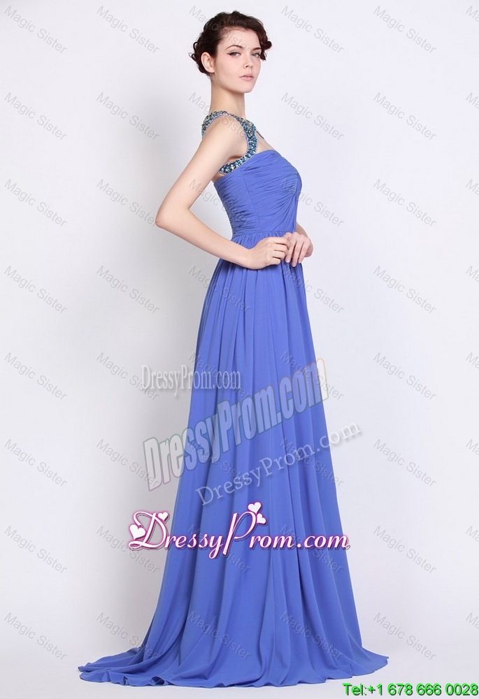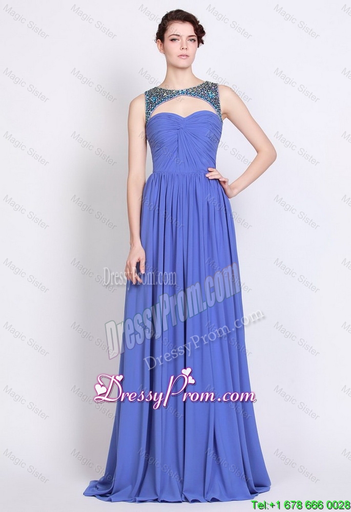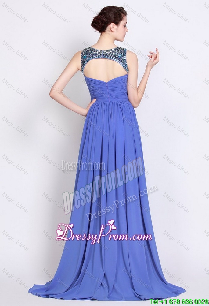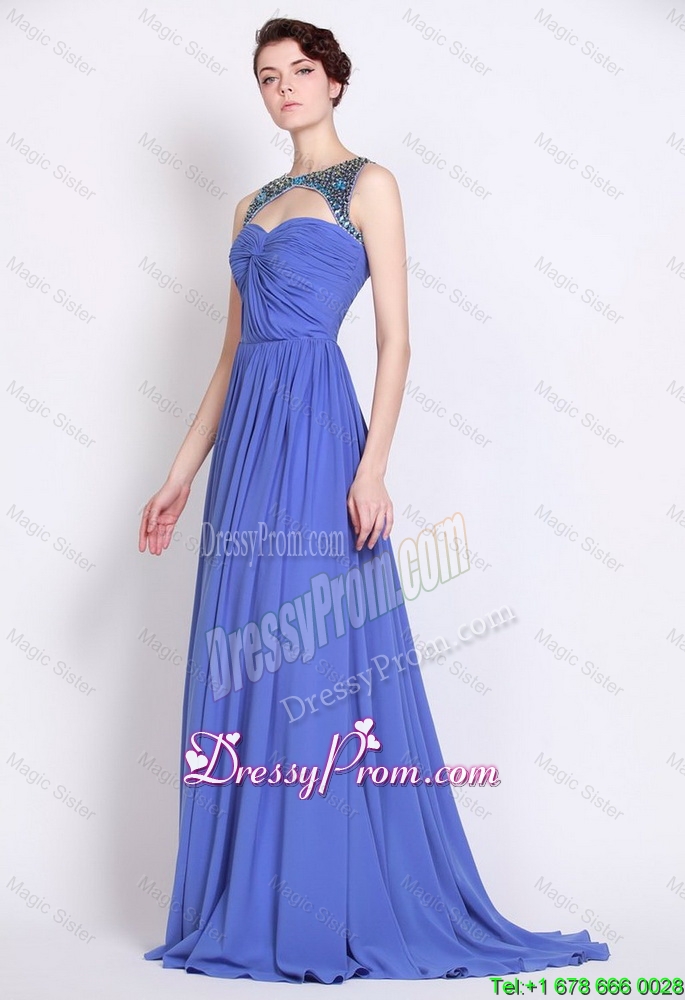 Neckline : BateauShown Color : BlueSilhouette : EmpireSleeve Length : sleevelessHemline : with trainBack Detail : ZipperFabric : ChiffonEmbellishment : Beading,RuchingOccasion : Prom,Formal Evening,PageantSeason : Spring,Summer,Fall,Winter