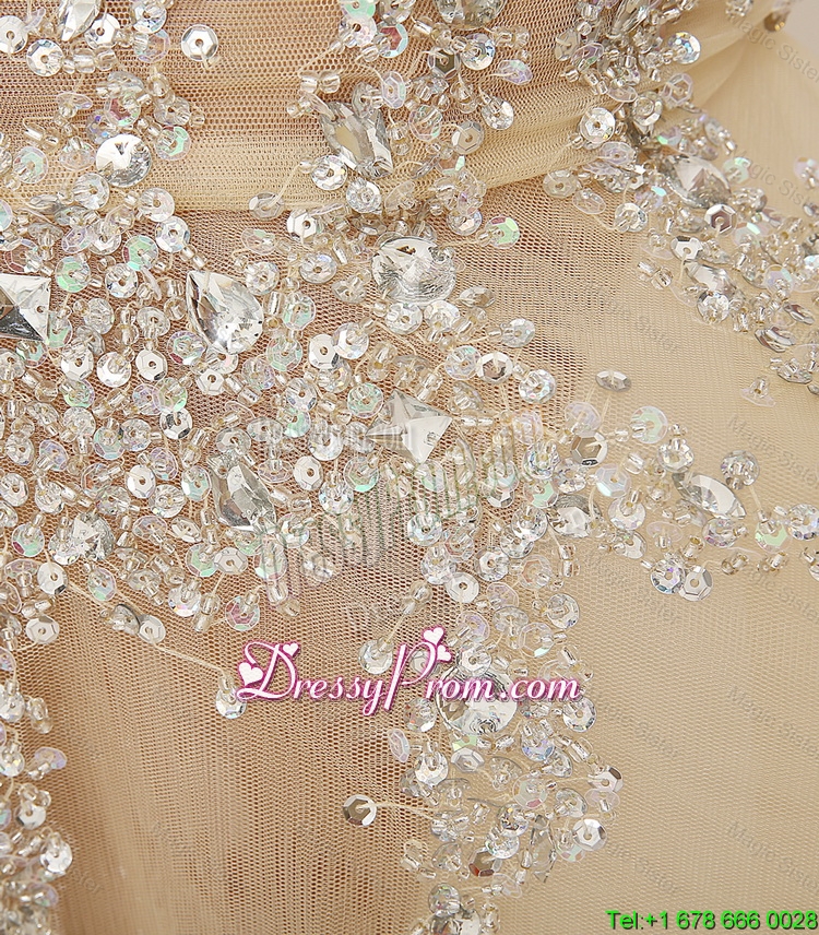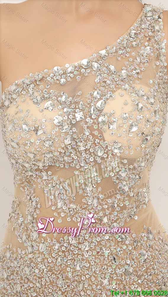 Neckline : One shoulderShown Color : ChampagneSilhouette : MermaidSleeve Length : sleevelessHemline : floor lengthBack Detail : Side zipperFabric : TulleEmbellishment : BeadingOccasion : Prom,Formal Evening,PageantSeason : Spring,Summer,Fall,Winter