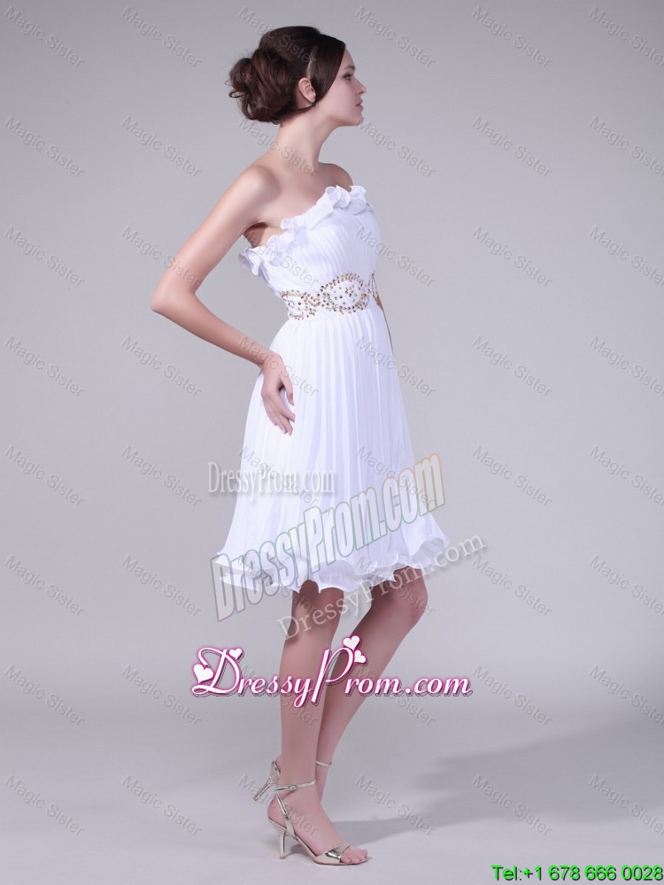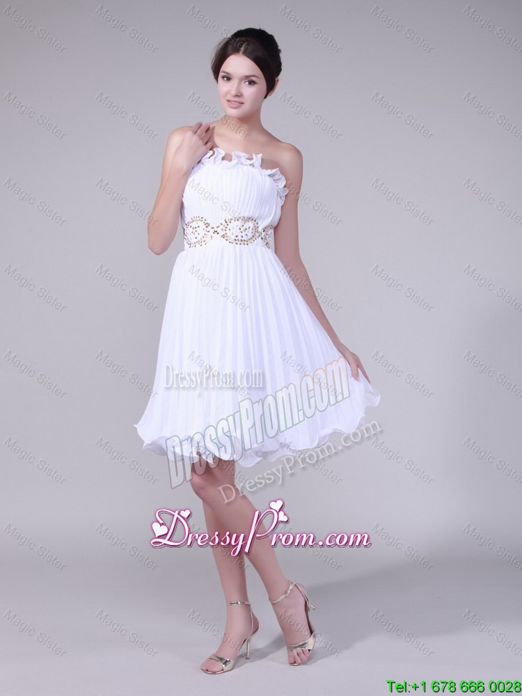 Neckline : StraplessShown Color : WhiteSilhouette : EmpireSleeve Length : sleevelessHemline : mini lengthBack Detail : ZipperFabric : ChiffonEmbellishment : BeadingOccasion : Prom,Party,Cocktail,Homecoming,Graduation,HolidaySeason : Spring,Summer,Fall