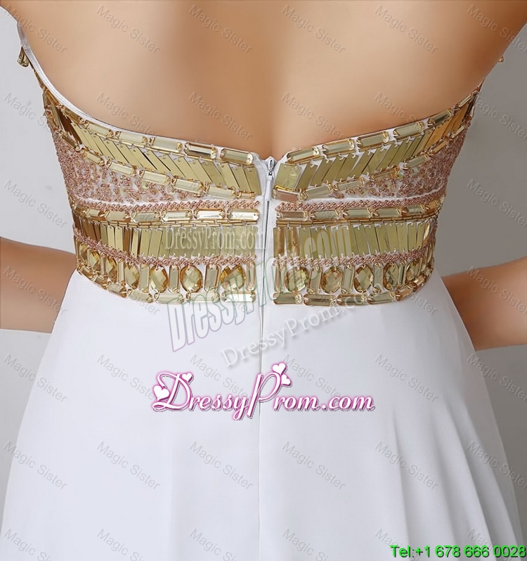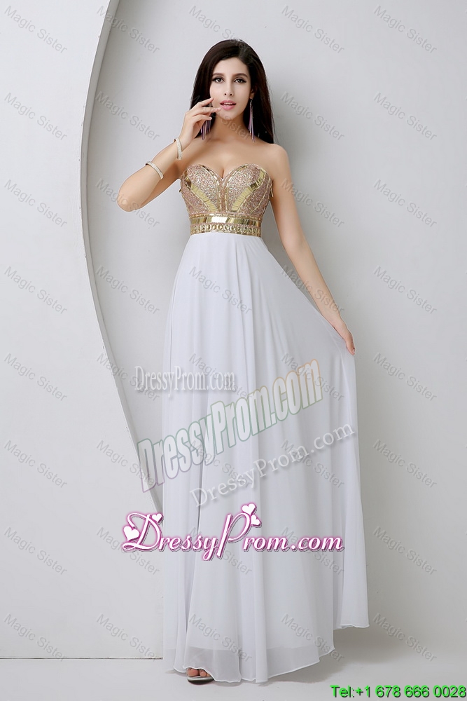 Neckline : SweetheartShown Color : WhiteSilhouette : EmpireSleeve Length : sleevelessHemline : floor lengthBack Detail : ZipperFabric : ChiffonEmbellishment : Beading,SequinsOccasion : Prom,Formal Evening,Graduation,PageantSeason : Spring,Summer,Fall,Winter