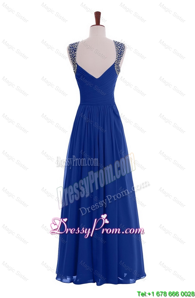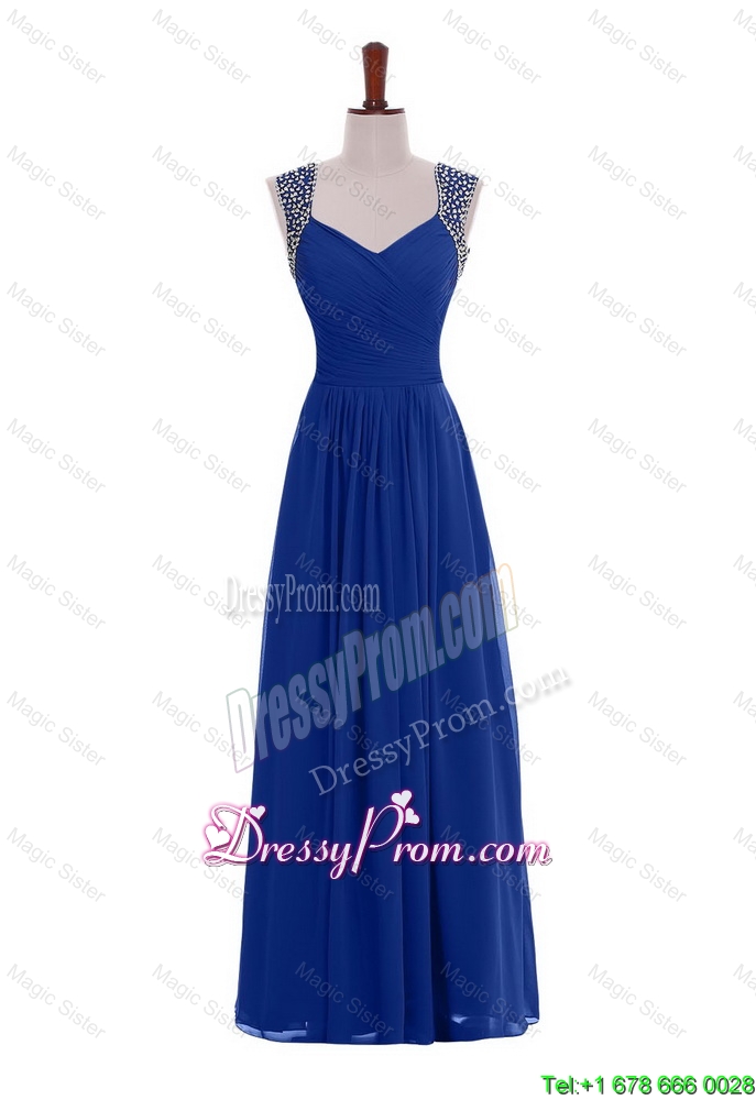 Neckline : StrapsShown Color : Royal BlueSleeve Length : sleevelessHemline : floor lengthBack Detail : Side zipperFabric : ChiffonEmbellishment : Beading,RuchingOccasion : Prom,Formal Evening,Homecoming,Graduation,HolidaySeason : Spring,Summer,Fall,Winter