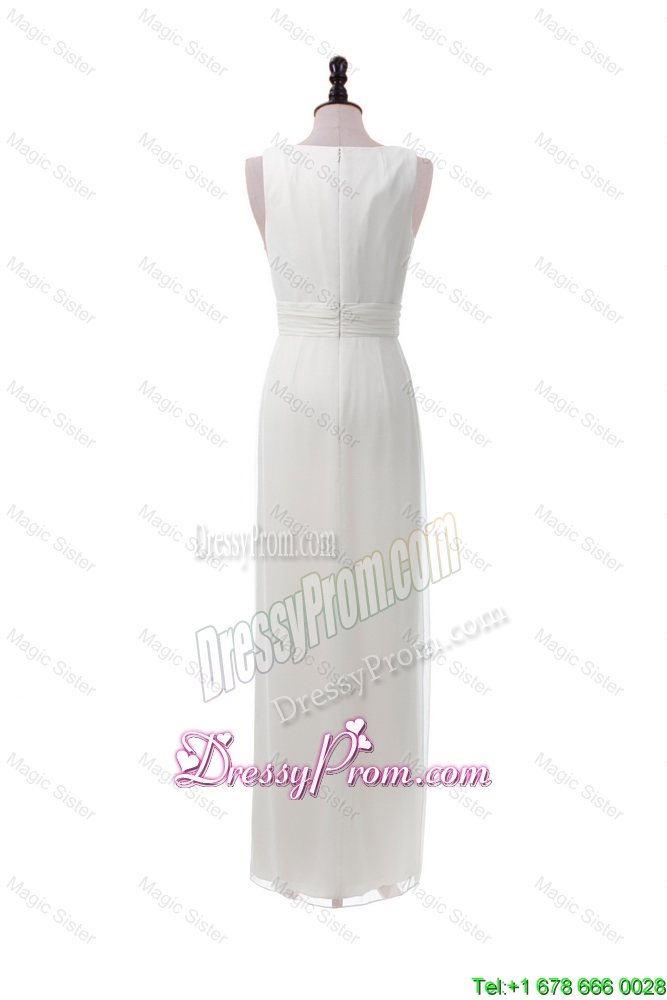 Neckline : V-neckShown Color : WhiteSilhouette : EmpireSleeve Length : sleevelessHemline : floor lengthBack Detail : ZipperFabric : ChiffonEmbellishment : RuchingOccasion : Prom,Formal Evening,Homecoming,GraduationSeason : Spring,Summer,Fall,Winter