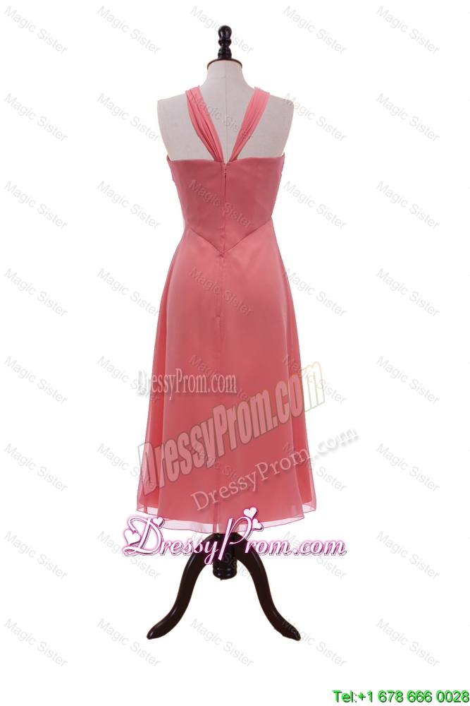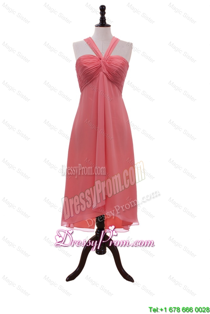 Neckline : Halter topShown Color : Watermelon RedSilhouette : ShortSleeve Length : sleevelessHemline : tea lengthBack Detail : ZipperFabric : ChiffonEmbellishment : RuchingOccasion : Prom,Party,Cocktail,Homecoming,Graduation,HolidaySeason : Spring,Summer,Fall