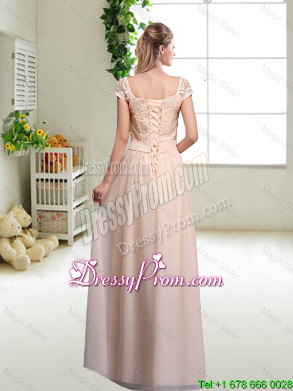 Neckline : SquareShown Color : ChampagneSilhouette : Column/SheathSleeve Length : cap sleevesHemline : floor lengthBack Detail : ZipperFabric : ChiffonEmbellishment : Lace,BowknotOccasion : Prom,Party,Homecoming,Wedding PartySeason : Spring,Summer,Fall,Winter