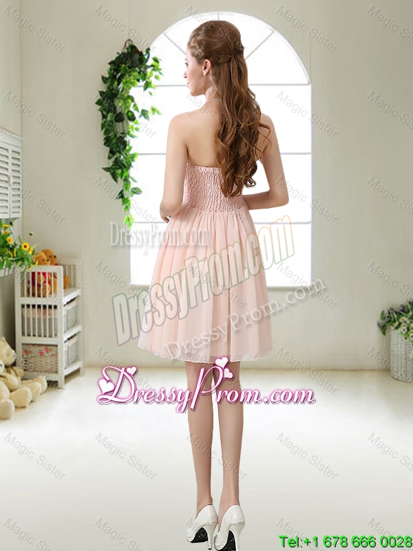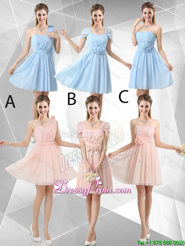 Neckline : Strapless Shown Color : Pink ,Light Blue Silhouette : Short Sleeve Length : sleeveless Hemline : mini length Back Detail : Lace up Fabric : Chiffon Embellishment : Ruching,Hand Made Flower Occasion : Prom,Party,Homecoming,Wedding Party Season : Spring,Summer,Fall