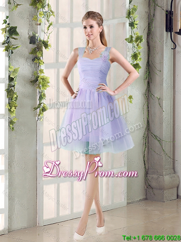 Neckline : StrapsShown Color : LavenderSilhouette : A-lineSleeve Length : sleevelessHemline : mini lengthBack Detail : Lace upFabric : TulleEmbellishment : Ruching,Hand Made FlowerOccasion : Prom,Party,Homecoming,Wedding PartySeason : Spring,Summer,Fall