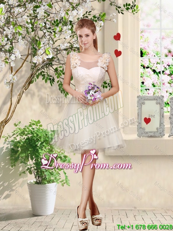Neckline : Straps Shown Color : Champagne Silhouette : A-line Sleeve Length : sleeveless Hemline : mini length Back Detail : Lace up Fabric : Tulle Embellishment : Hand Made Flower Occasion : Prom,Party,Homecoming,Wedding Party Season : Spring,Summer,Fall