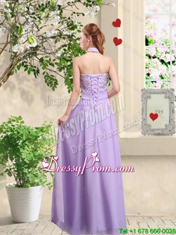 Neckline : Halter topShown Color : LavenderSilhouette : EmpireSleeve Length : sleevelessHemline : floor lengthBack Detail : ZipperFabric : ChiffonEmbellishment : Lace,BowknotOccasion : Prom,Party,Homecoming,Wedding PartySeason : Spring,Summer,Fall,Winter