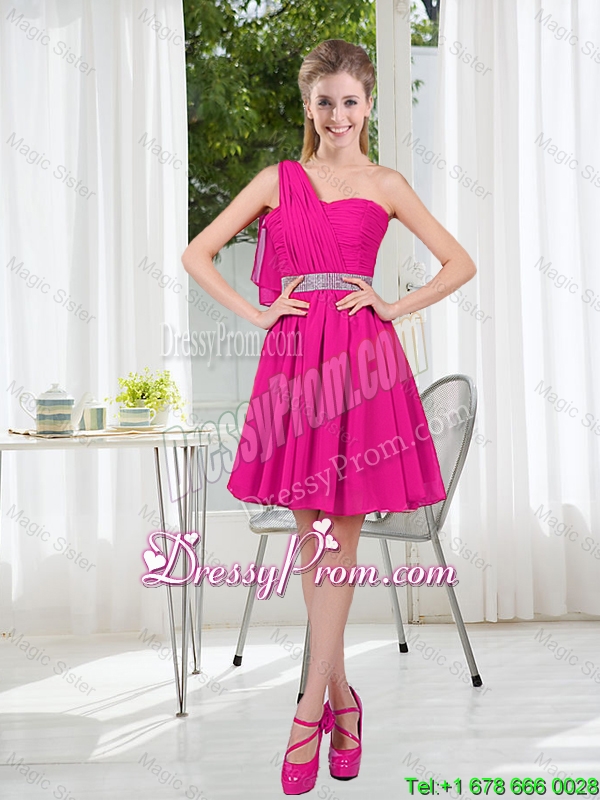 Neckline : One shoulderShown Color : Hot PinkSilhouette : A-lineSleeve Length : sleevelessHemline : mini lengthBack Detail : ZipperFabric : ChiffonEmbellishment : Beading,RuchingOccasion : Prom,Party,Homecoming,Wedding PartySeason : Spring,Summer,Fall
