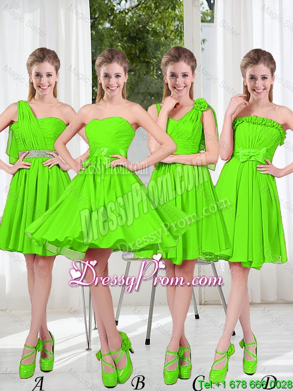 Neckline : One shoulder Shown Color : Spring Green Silhouette : A-line Sleeve Length : sleeveless Hemline : mini length Back Detail : Zipper Fabric : Chiffon Embellishment : Beading,Ruching,Bowknot Occasion : Prom,Party,Homecoming,Wedding Party Season : Spring,Summer,Fall