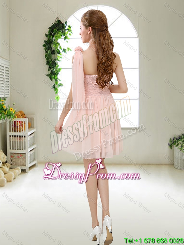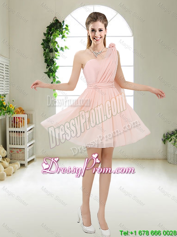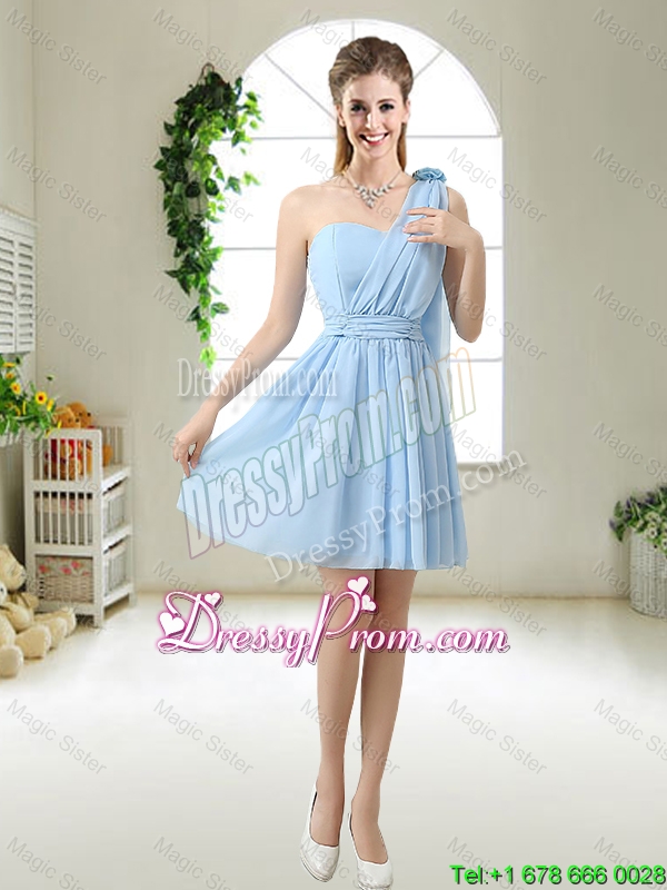 Neckline : One shoulder Shown Color : Light Blue Silhouette : Short Sleeve Length : sleeveless Hemline : mini length Back Detail : Lace up Fabric : Chiffon Embellishment : Ruching,Hand Made Flower Occasion : Prom,Party,Homecoming,Wedding Party Season : Spring,Summer,Fall
