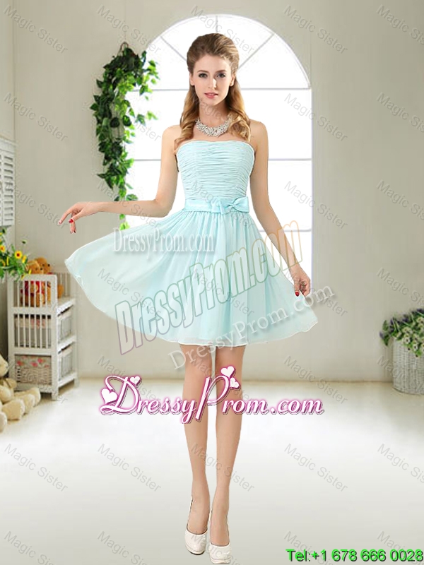 Neckline : V-neckShown Color : Light BlueSilhouette : A-lineSleeve Length : sleevelessHemline : mini lengthBack Detail : ZipperFabric : ChiffonEmbellishment : Ruching,BowknotOccasion : Prom,Party,Homecoming,Wedding PartySeason : Spring,Summer,Fall