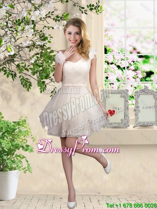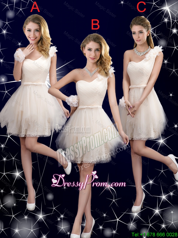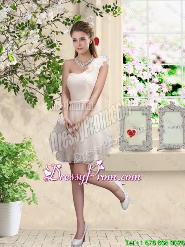 Neckline : One shoulder Shown Color : Champagne Silhouette : Short Sleeve Length : sleeveless Hemline : mini length Back Detail : Zipper Fabric : Tulle Embellishment : Belt,Hand Made Flower Occasion : Prom,Party,Homecoming,Wedding Party Season : Spring,Summer,Fall