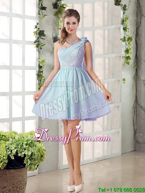 Neckline : One shoulder Shown Color : Blue Silhouette : A-line Sleeve Length : sleeveless Hemline : mini length Back Detail : Lace up Fabric : Chiffon Embellishment : Lace,Hand Made Flower Occasion : Prom,Party,Homecoming,Wedding Party Season : Spring,Summer,Fall